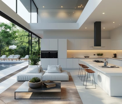 Layered architectural lighting combining task, ambient, and accent illumination, with options for smart-home integration to support both cooking and entertaining.