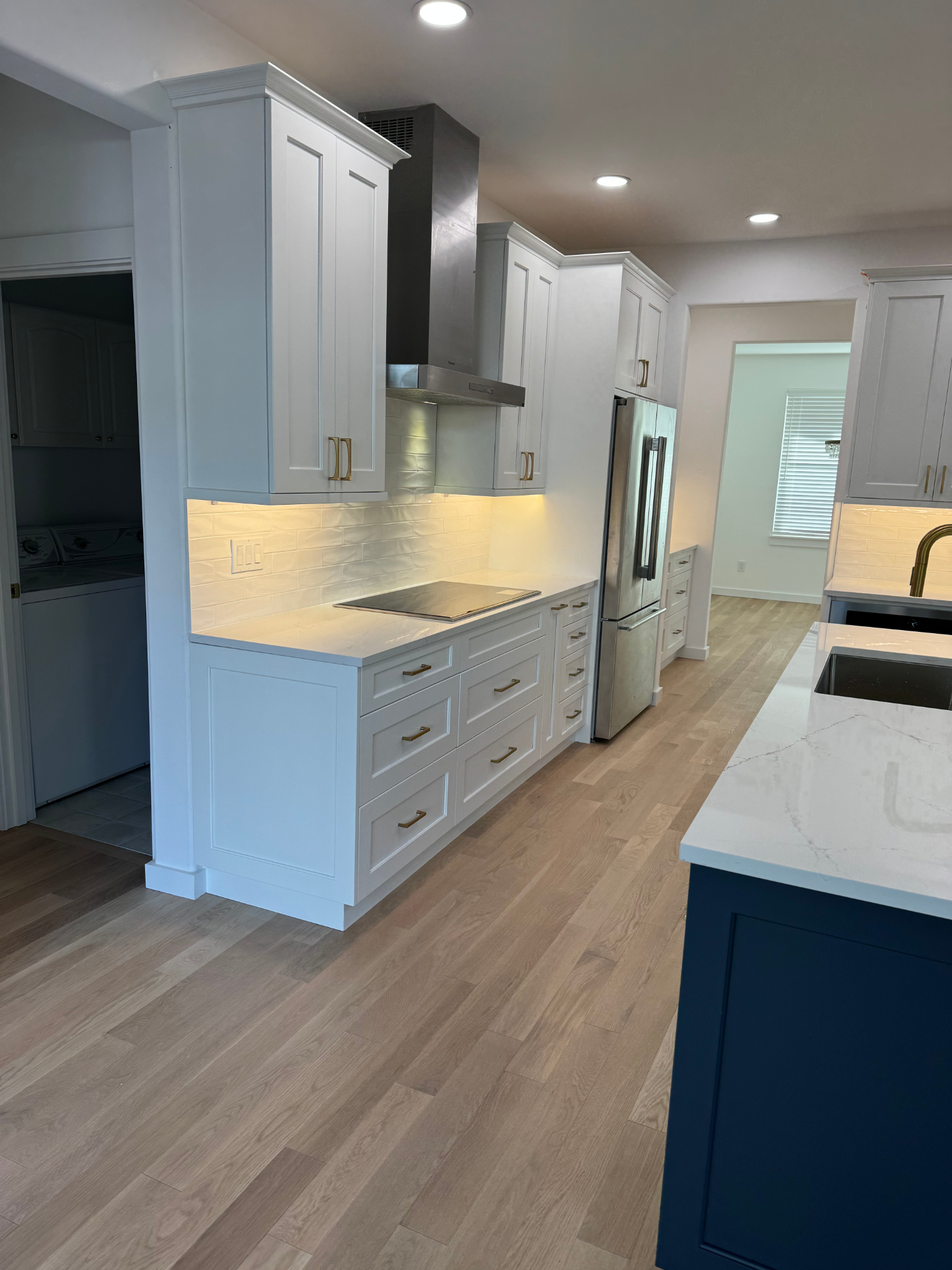 We installed custom-painted cabinetry with upgraded storage solutions, a quartz waterfall island, and new premium appliances integrated into a clean, efficient layout. Soft-white perimeter cabinets paired with deep-blue island cabinetry give the space dimension and a timeless look. Warm hardwood flooring ties the kitchen into the dining area, where we also updated the fireplace with a new surround and floating mantel to match the home’s modern character. New lighting, including pendant fixtures over the island and under-cabinet LED lighting, completes the atmosphere with a soft, elegant glow.