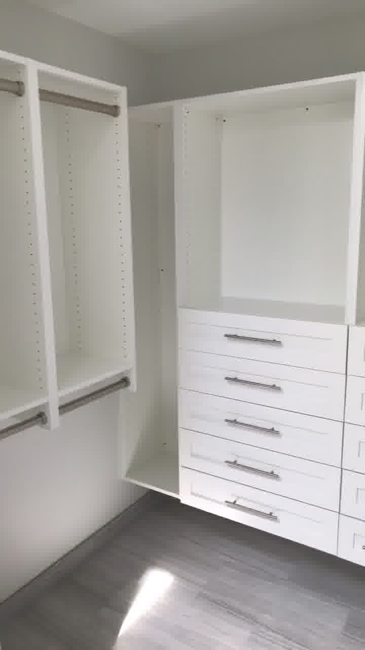 Full-height cabinets, adjustable hanging sections, and organized drawer stacks designed to maximize storage.