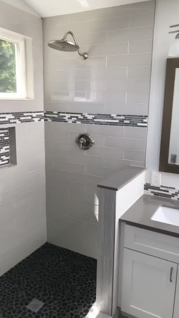 Open shower with pebble-floor tiles, niche storage, and modern wall tile layout for a clean, bright finish.